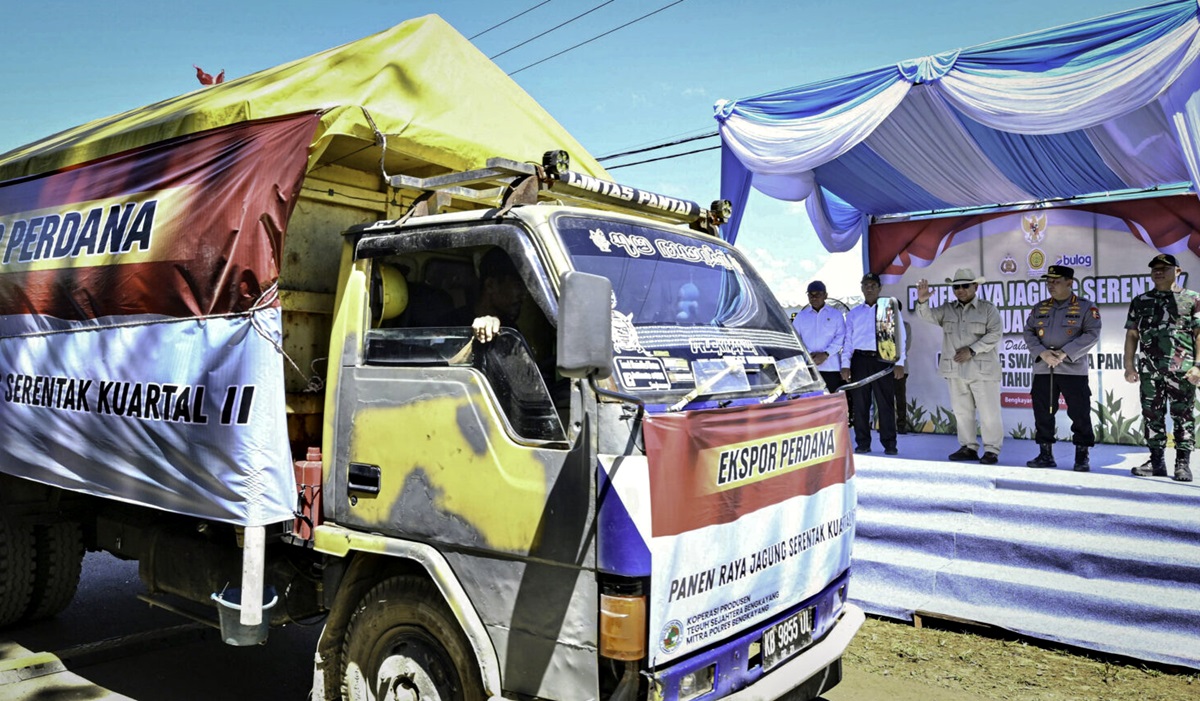 Presiden Prabowo Subianto secara resmi melepas keberangkatan ekspor perdana jagung sebanyak 1.200 ton dari Kabupaten Bengkayang, Kalimantan Barat, ke Kuching, Malaysia, pada Kamis, 5 Juni 2025
