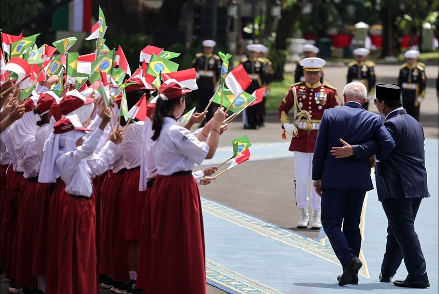 Presiden Republik Indonesia Prabowo Subianto menyambut langsung Presiden Lula da Silva dan Ibu Janja di sisi barat Istana Merdeka.