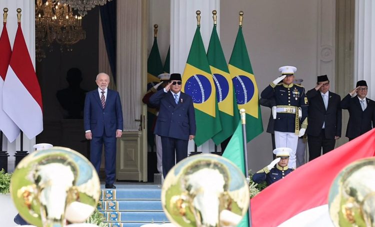 Dengan langkah tegap dan penuh wibawa, Prabowo dan Lula meninjau barisan prajurit di halaman Istana Merdeka.